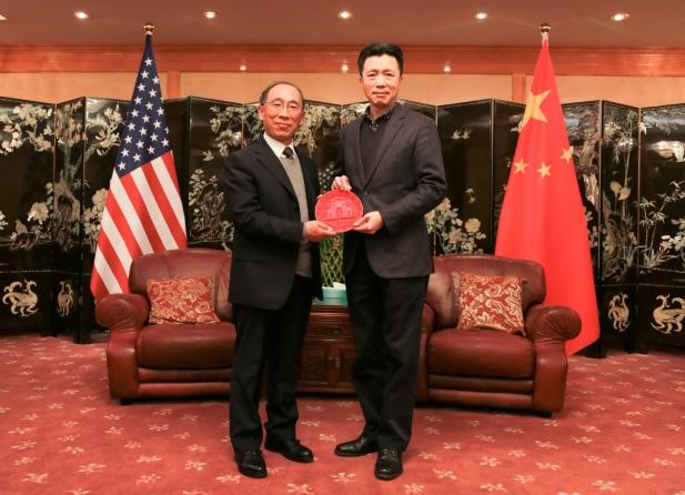 肖贵清副院长向查立友代总领事赠送“清华大学百年校庆礼盘”