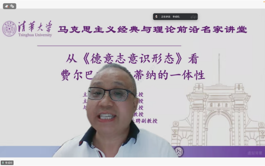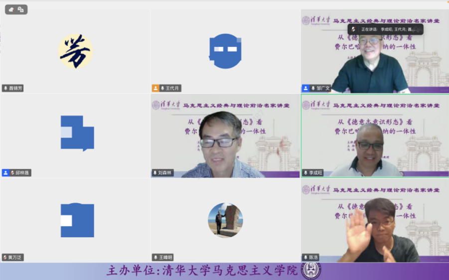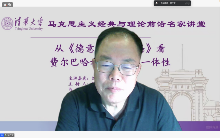 2025年9月25日19:00—21:30,清华大学马克思主义经典与理论前沿名家讲堂第二十一讲成功举办。山东大学哲学学院刘森林教授应邀作了题为“从《德意志意识形态》看费尔巴哈与施蒂纳的一体性”的学术讲座。本次讲座由清华大学马克思主义学院邹广文教授主持,北京大学哲学系聂锦芳教授、清华大学马克思主义学院李成旺教授、哲学系陈浩副教授担任与谈人。讲座通过腾讯会议平台进行,吸引了校内外 300 多名师生参与,引发热烈反响。