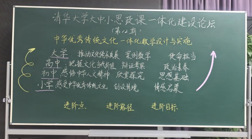 各学段教学设计汇报和讨论完毕后,与会老师们通过集体讨论形成了本专题的大中小学思政课一体化教学的目标进阶路线图:小学学段注重引导学生感受中华优秀传统文化,通过创设情境实现情感启蒙;初中学段强调感悟中华人文精神,通过欣赏探究活动引导学生在感性体验和理性认知的有机结合中增强思想基础;高中学段注重把握文化当代价值,通过辩证考察培养政治素养;大学学段注重推动文化传承发展,通过案例教学强化青年学生的使命担当。